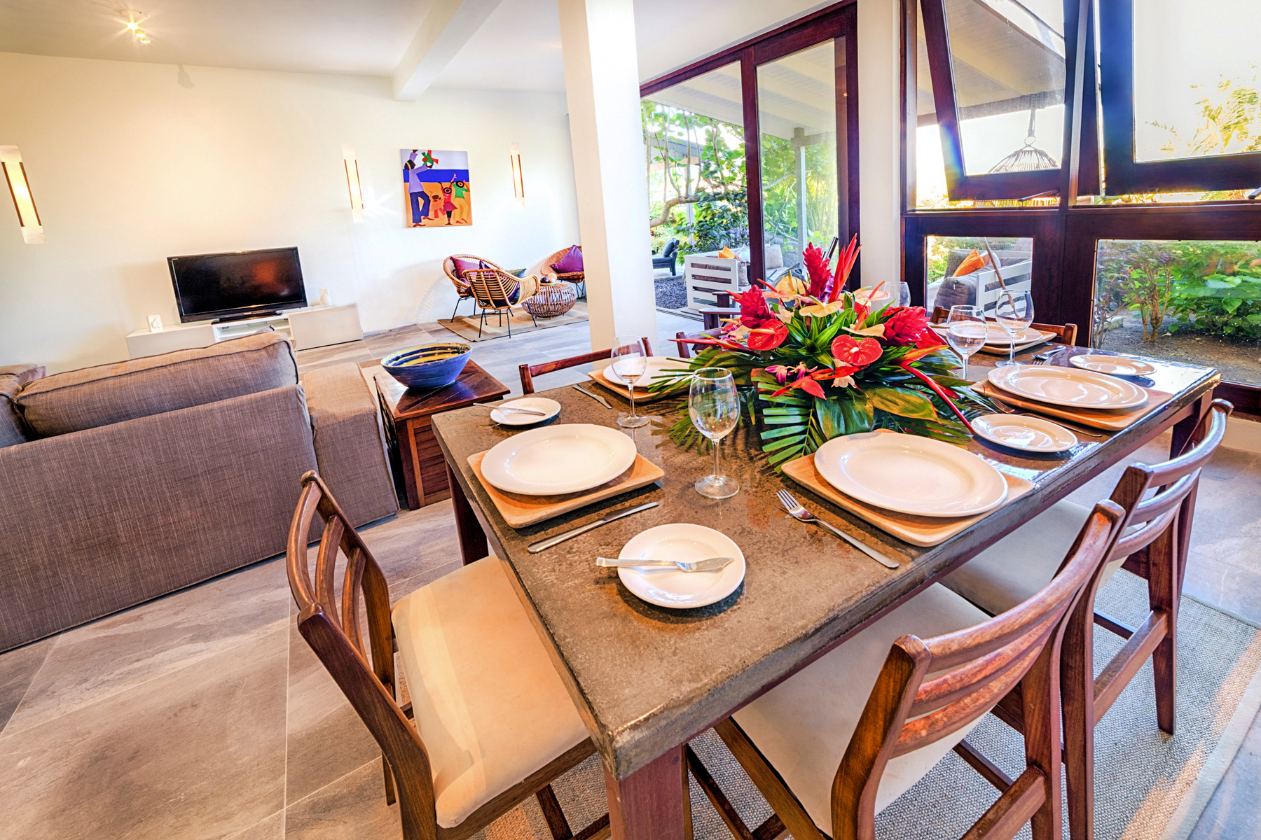 This spacious three-bedroom villa welcomes you with spectacular views of the ocean, gardens, and mountains. The floor-to-ceiling windows and vaulted ceilings bring the outdoor scenery indoors throughout this two-floor villa.